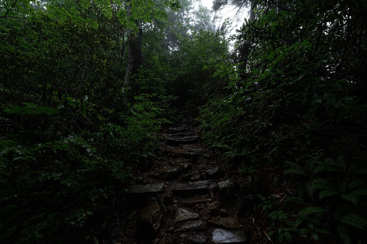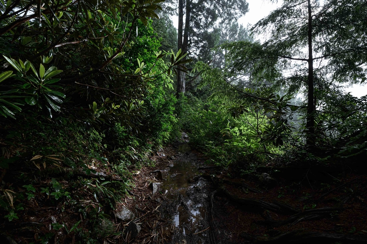 雨を受けて少し幻想的になった森の中を歩きます。