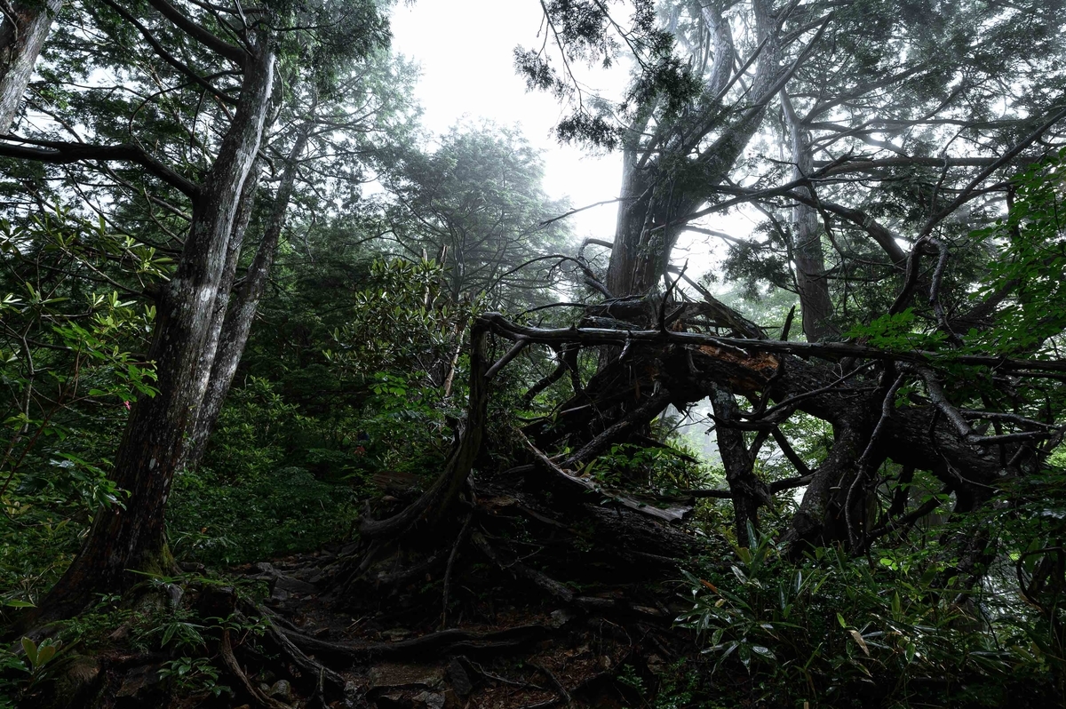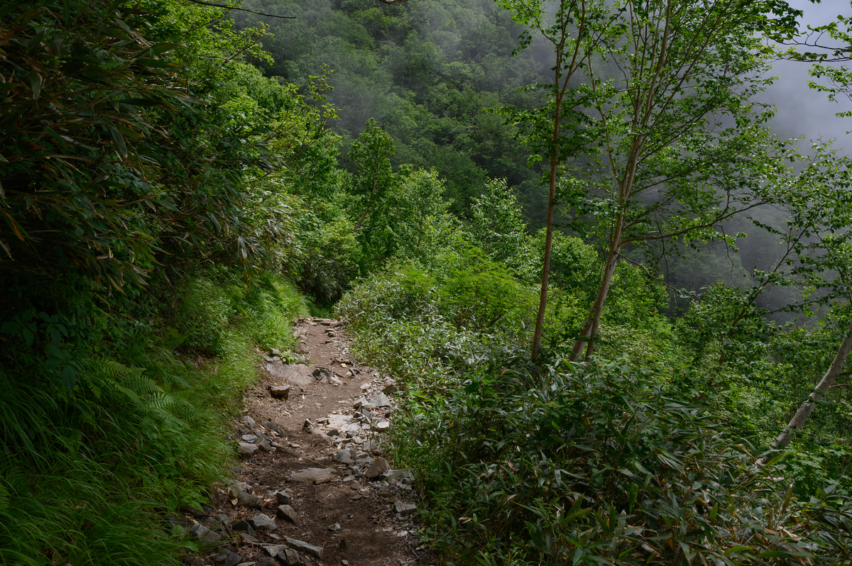 北アルプスの森らしく薄暗い感じはあまりなく、晴れていれば気持ちのよさそうな樹林帯が続きます。