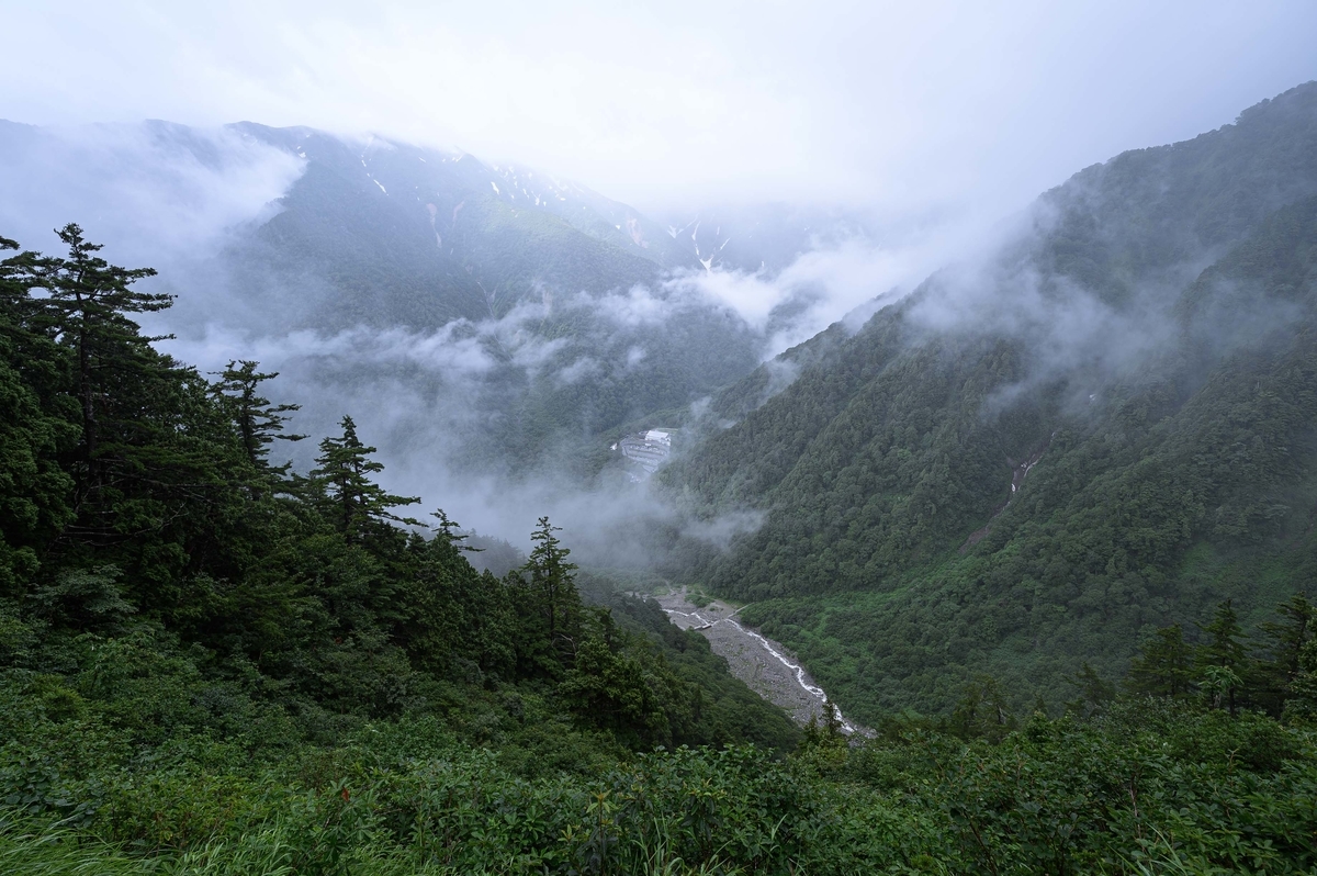 眼下に見えるのが扇沢駐車場。 まだ8時前だからか、あいにくの天気だからかは判断つきませんがまだガラガラです。