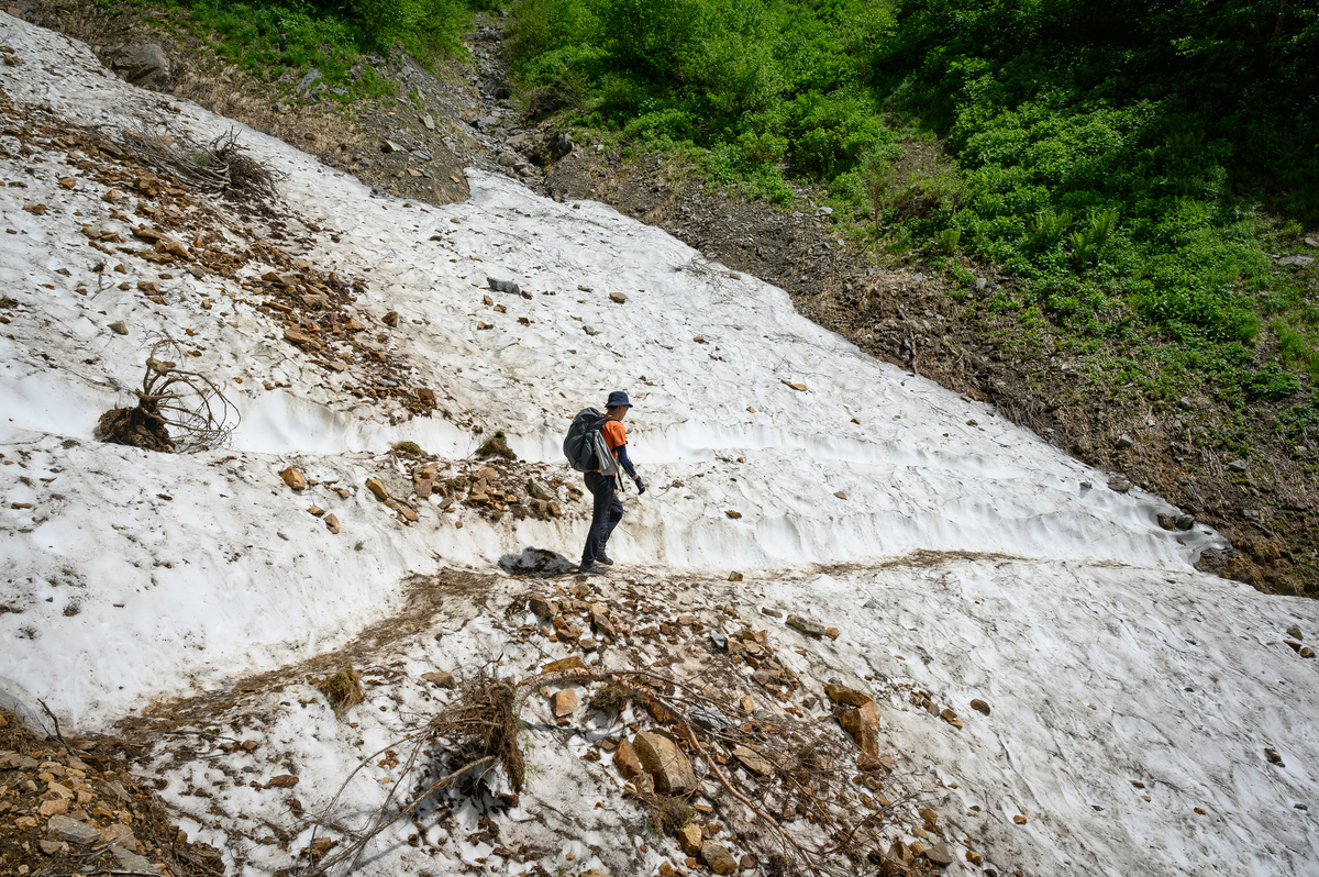 7月終盤なのに雪渓を横切ることになります。