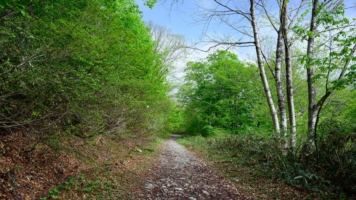 初夏の日差しが気持ちいいし、白馬岳がずっと見えて景色もよく、足取りは自然と軽やかです。