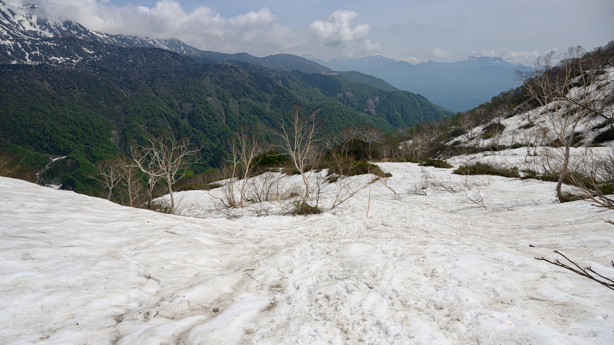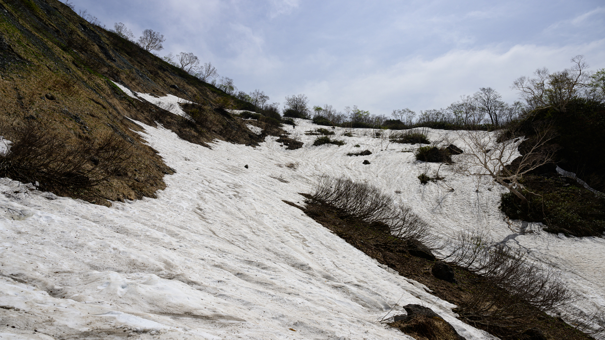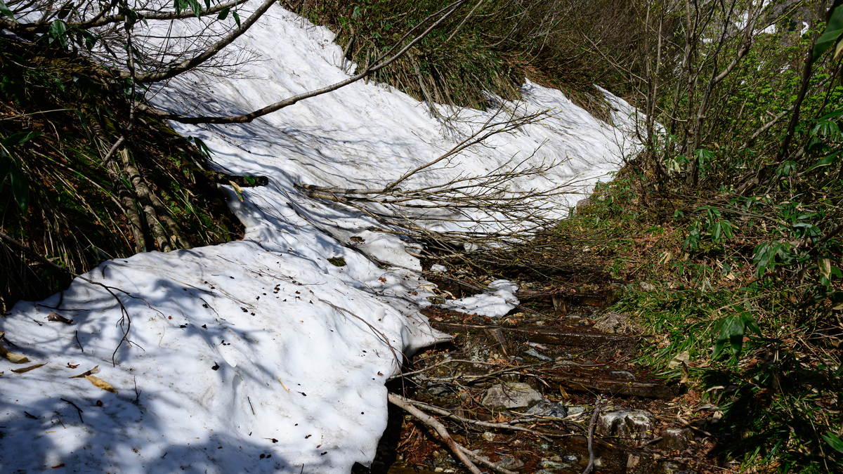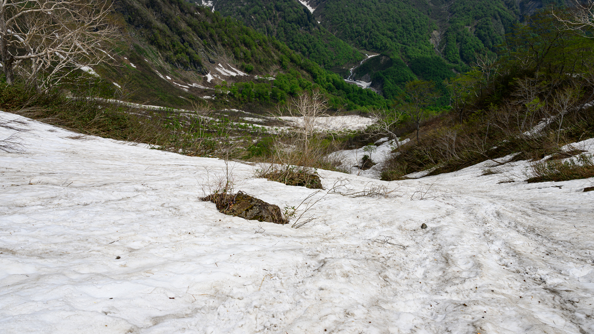 だいぶ下りてきた感じがありますが、雪渓はまだ続きます。
