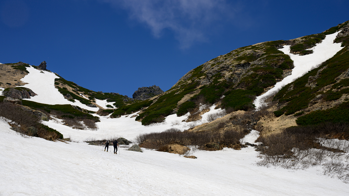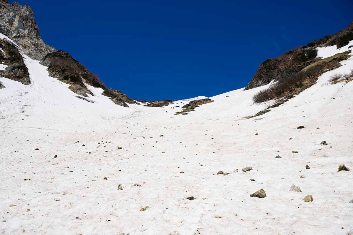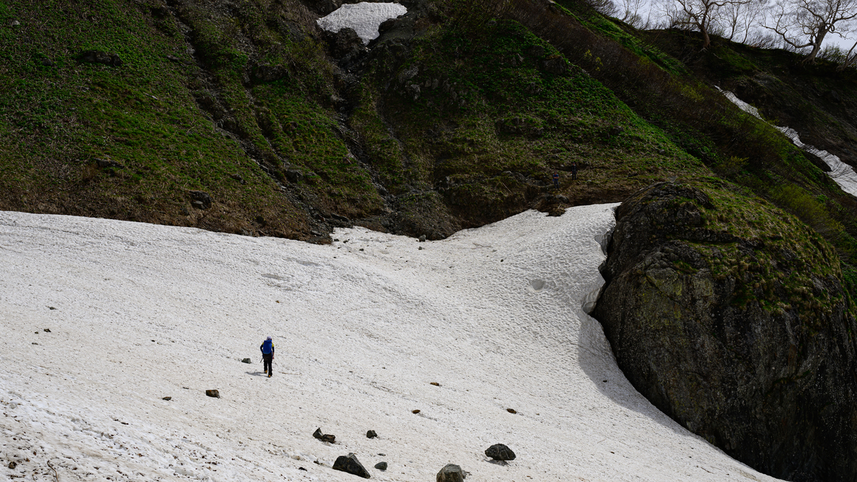 先を行く登山者さんの大きさから雪渓の大きさを感じ取ってほしいです。