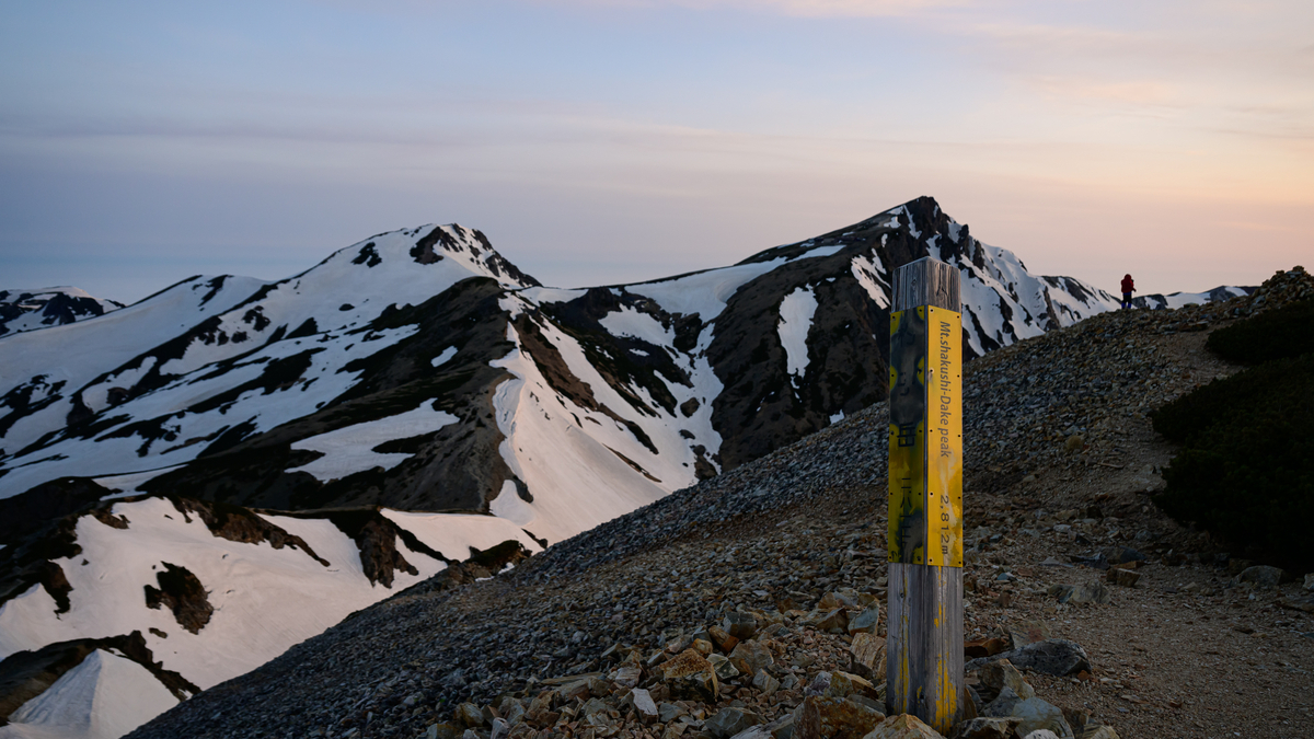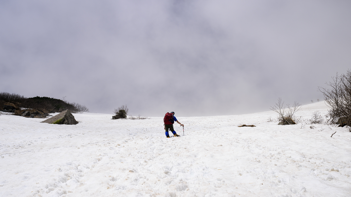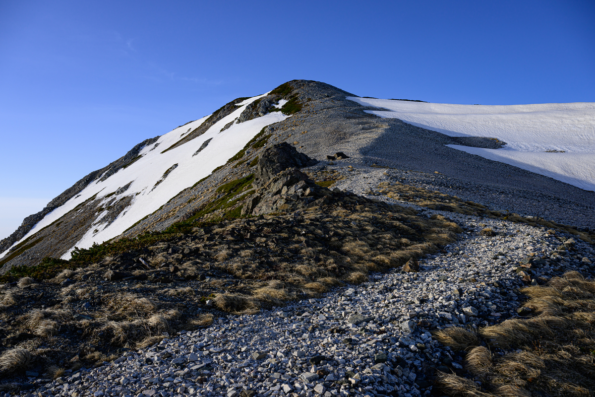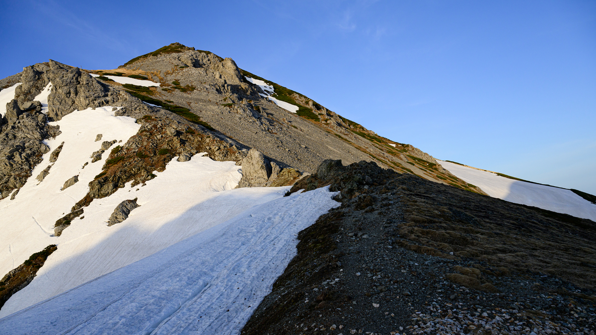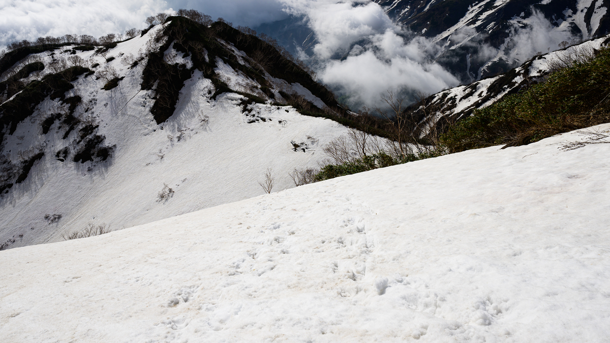 まず向かうは杓子岳、そのまま隣り合う鑓ヶ岳を越え、そこから雪渓側へ下山を開始。