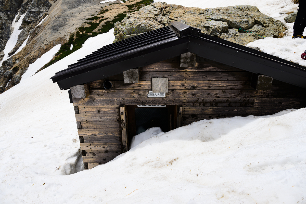 急登を登り始めてから約1時間、まだまだ雪に埋もれた避難小屋に到着。