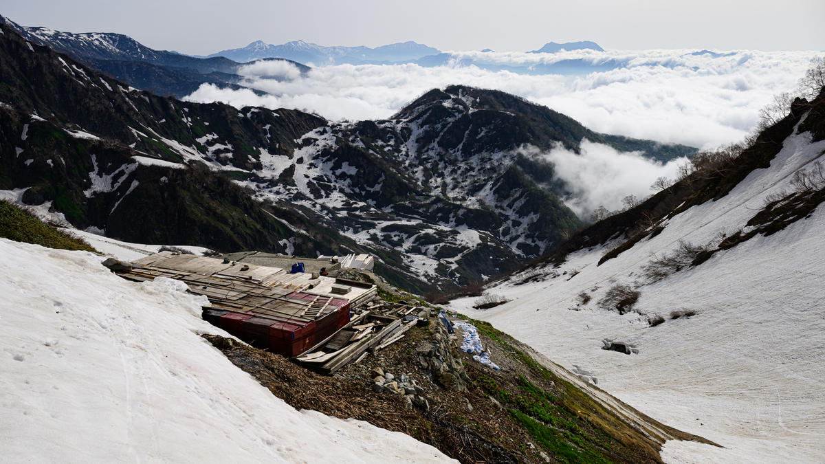 分岐から1時間半ほど下りてくると・・・見えてくるのが解体中の白馬鑓温泉小屋。