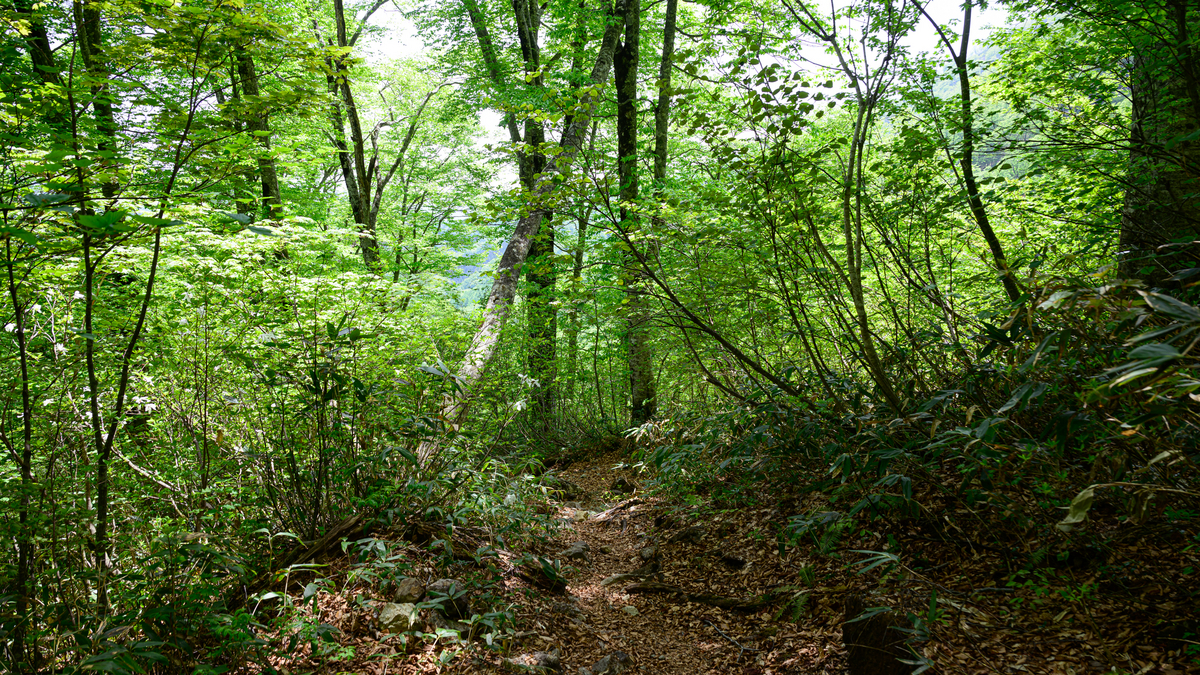 登り返し地点から約30分ほど下ると傾斜はなくなります。